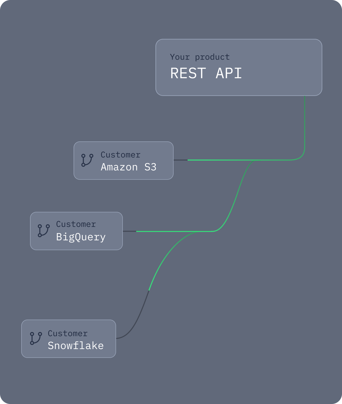 Connect your platform to your customer's data warehouse or data lake. Ingest and query your customer's data in minutes, not months.